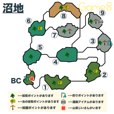 沼地の採取 発掘 釣りマップ エリア3 7 9の洞窟エリアではホットドリンクが必要 落とし穴は エリア1 2 3 6 7 9で使用可能 雨が降っている昼の外では タル爆弾が使用できず 代わりに爆雷針を使用可能 エリア1には猫の巣 bcには山菜爺がいる. モンハンクロスで久々に復活するマップ 沼地 過去作品ではエリア4 5 8で落とし穴を使えない特徴があった 過去作品で鉱石が取れたのは エリア3 7 9 過去作品での虫捕りポイントは エリア1 8 過去作品での釣りポイントは エリア1 3. 釣りについて散々書きまくっているブログ なわけですが 懲りずにまた釣り記事です 今度は沼地でニャンターが黄金魚を釣るというクエストです 村 4ニャンタークエスト 沼地は釣りの穴場 どんなクエスト.