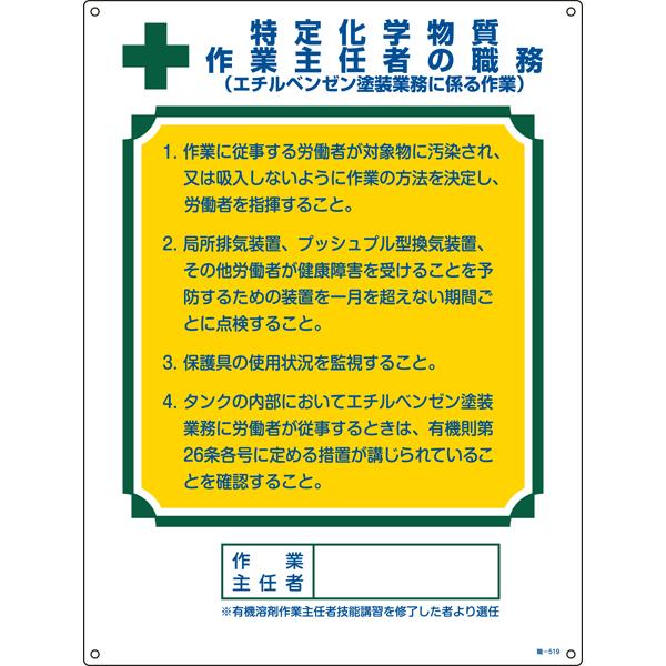 作業主任者の職務標識 特定化学物質作業主任者の職務 エチルベンゼン塗装業務に係る作業 職 519 049519 安全屋さん 通販 Yahoo ショッピング